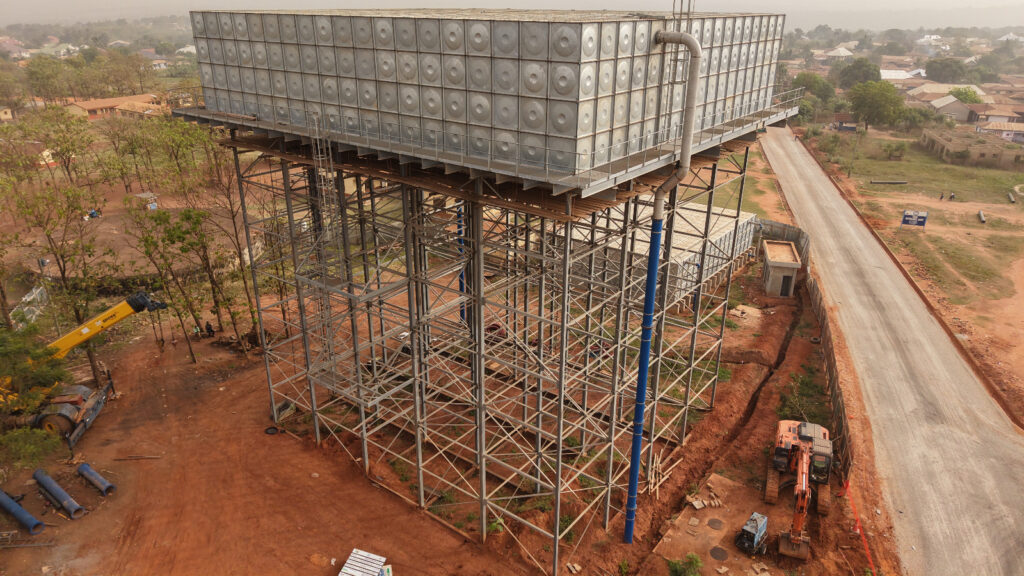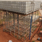 Additional structures visible include the Distribution Chamber, which regulates water flow across the treatment system, as well as the Electrical Building that supports power supply and control operations. The Filter unit and Clear Water Tank are also identified, representing the final stages of purification and storage before distribution.